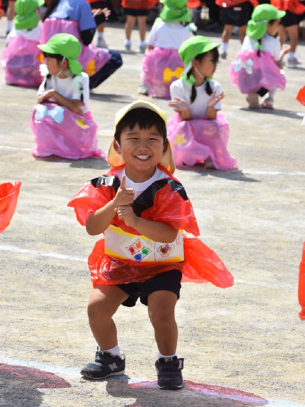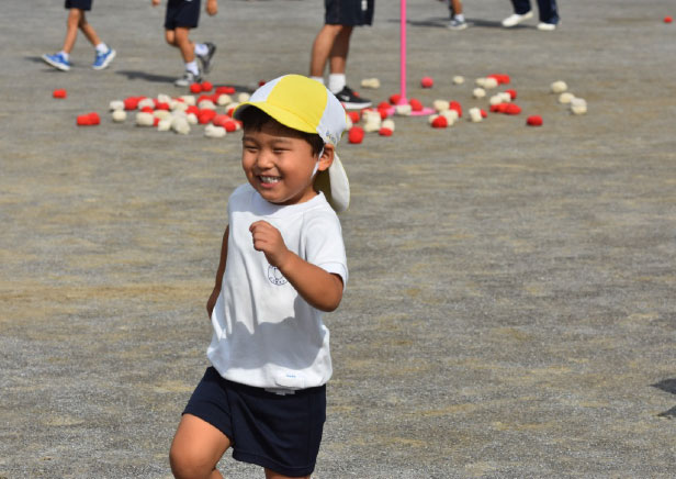 運動会当日、この季節にしては暑かったのですが、快晴で運動会日和でした。年少さんの最初の競技は玉入れ。年少さん対年中さんの対決です。列になってかごのあるところまで一目散に走って行くのですが、長男は最初間違って年中さんのかごに向かって走って行きました。かごに向かって、一生懸命、沢山、玉を入れていました。2回行い、2回とも大差で年少さんの勝ち!長男は笑顔で喜んでいました。次はかけっこ。2人一組で競争です。相手は女の子です。この時期は女の子の方が、背が高いこともありますし、いかんせん我が家の長男、ちょっとわがままボディなので、早く走れるのか?心配でした。いつもの走っている様子を見ても、決して格好の良いランニングフォームではなかったので。本番のかけっこの様子を見ていると、意外や意外。結構格好の良いランニングフォームではありませんか。わがままボディは急に変わりませんが、本人も満足いく走りだったのか、笑顔が絶えませんでした。