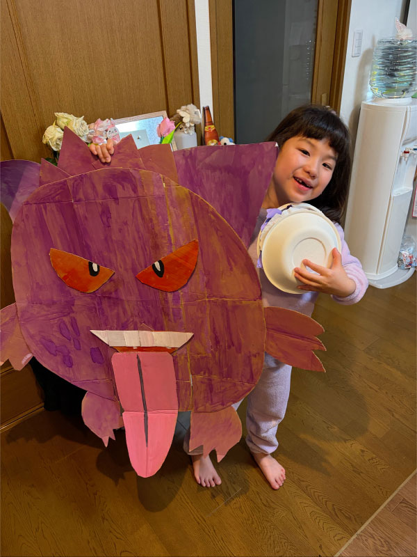 があります。それは三女の誕生日です。最近、子供達のブームがポケモンで、おのおのお気に入りのポケモンがいます。三女のお気に入りはゲンガーです。そこで長女と次女は三女のために等身大のゲンガーを作ってくれました。何か欲しいものを買ってあげるのではなく、自分達で作った物をプレゼントするのは良いですね。等身大のゲンガーは今、ソファーに座っていますが、果たしていつまでソファーに座らせておくのか、思ったよりも大きくてどうしようか、考え中です。