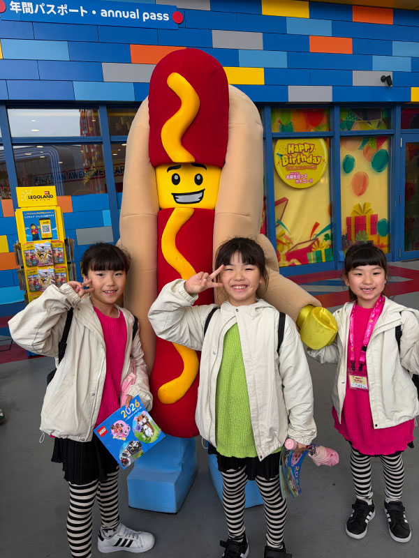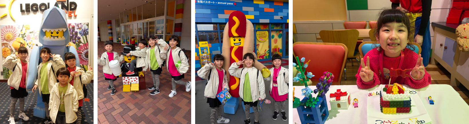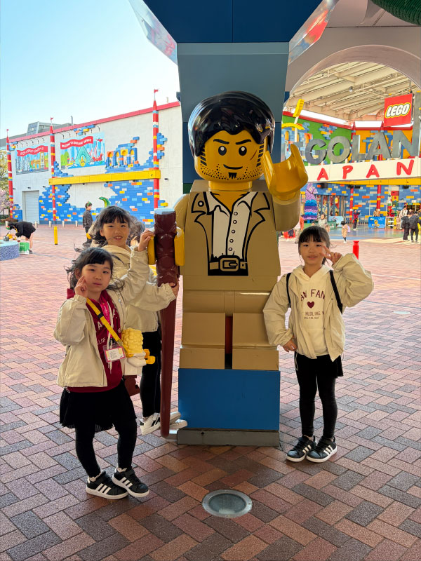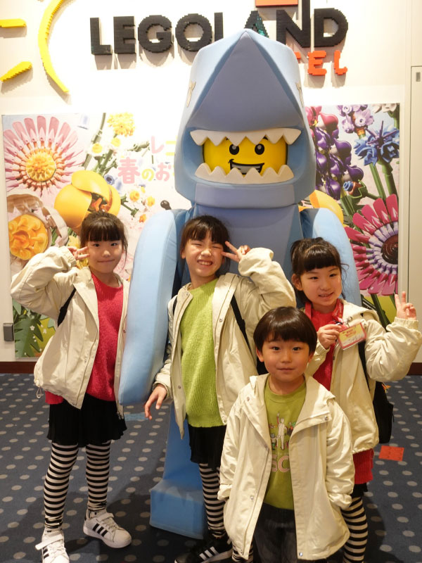 行ってきました。子供達は本当にレゴ好きで、長女はクリスマスプレゼントに毎年レゴをお願いするほど大好きです。もちろん三女も大好き。初めて乗る日本の新幹線で名古屋まで行き(初めての新幹線は台湾でした)、そこからさらに30分程度電車に乗ったらレゴランドです!ありとあらゆるところにレゴがあって、子供達は大興奮!残念ながら初日は雨が降ってしまい、お天気に恵まれなかったのですが、雰囲気は十分に味わうことが出来ました。今回は徹底してレゴにこだわろうと思い、レゴランドの目の前にあるレゴランドホテルに泊まりました。ホテル内はフロントも廊下も部屋もレゴ一色!楽しい雰囲気満載です。夜はバイキングだったのですが、三女の誕生日のお祝いをそのレストランでやってくれました。お祝いの仕方も可愛らしく、三女は大喜び。誕生日のケーキをみんなで食べて、非常に満足しました。