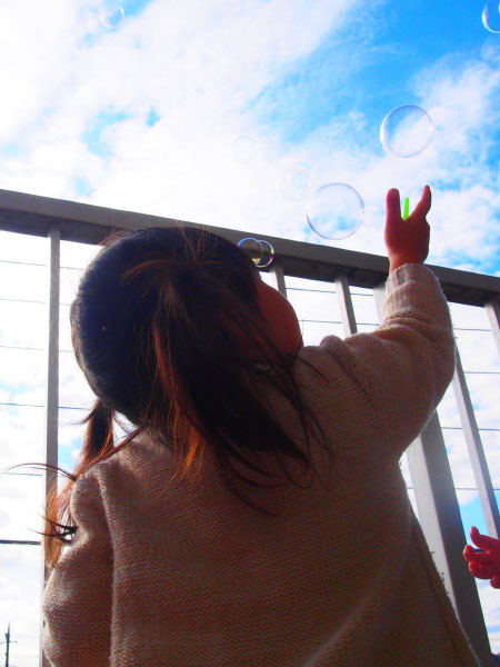 二人の娘達は、晴れやな青空にむかってシャボン玉で遊んでいます。寒さなんて子供達には関係ないようで、ずっとシャボン玉を飛ばしていました(ときに部屋の中に飛ばしていました。それは勘弁ですが)。
